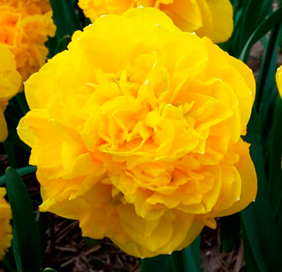 Потрясающий среднецветущий гибрид входит в группу Махровые нарциссы. В высоту он достигает до 35 см, а в ширину – 10 – 20 см. Листья глубокой сине-зеленой окраски. Цветки образуются махровые, крупного размера. Они имеют двойное количество лепестков и золотистую гофрированную коронку. Доли околоцветника широкие, окрашенные в насыщенный лимонно-желтый оттенок, с закругленными концами. Цветки размещены горизонтально и источают сладкий аромат. На одном цветоносе образуется по 3 – 4 эффектных бутончика.