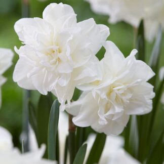 Махровые сорта просто поражают воображение разнообразием форм и расцветок. У представленного на фото экземпляра тоже необычный вид. В высоту многолетник достигает 35 – 40 см. Это популярный срезочный сорт. Период цветения начинается в апреле и длится весь май. Цветки белоснежные, крупные. В центре размещена розетка, состоящая из мелких долей коронки. Нарцисс источает сильный аромат.
